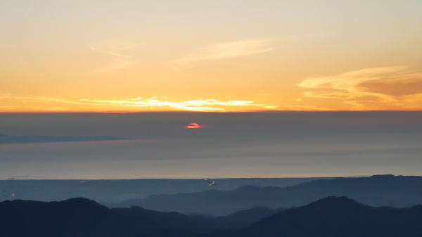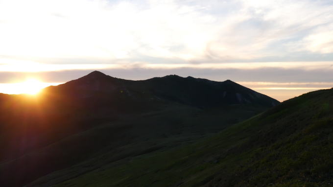 飯豊本山の左肩から昇る朝日(御西岳から撮影)
