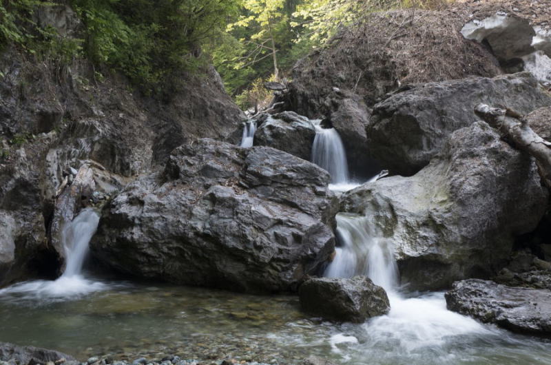 朝日が射し込む残雪の渓流