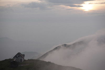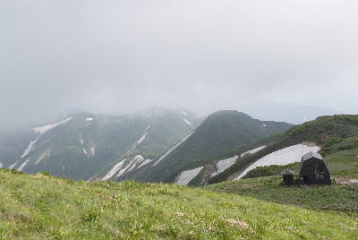 この頃の北股岳はガスに覆われて見えませんでした。昼前に頼母木小屋に戻って昼食を摂り半日を小屋の中で過ごしました。(山で携帯のワンセグTVが見られるのは天気図の確認ができますので心強く、