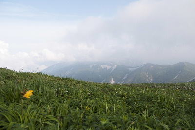 5時50分に杁差を出発し北股岳を目指して進む途中(地神山を過ぎた付近)で頼母木小屋の管理人さんと出 合い、雷警報が発令されたことを知りました。管理人さんは急いで頼母木小屋に戻るとのことで私も北股岳は諦めてすぐに小屋に戻ることにしました。