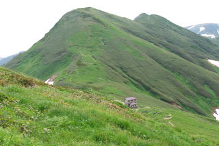 昨日の雨は上がり曇空の朝です。小屋前の草は朝露も付いていなかったので雨具を着ないで歩き始めたのですが小屋を下る