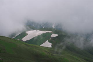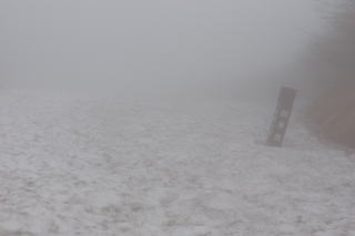 にしました。5時30分御西小屋を出発。ガスのために方向が確認できませんがとにかく山側に付いて進むことを心がけて脚