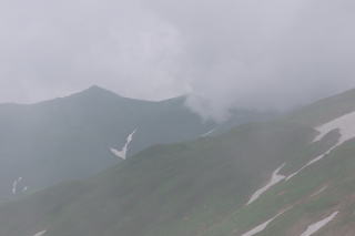 ことができました。そして烏帽子岳の頂上尾根に出た途端に猛烈な雨と風です。 合羽や顔にバチバチと音を