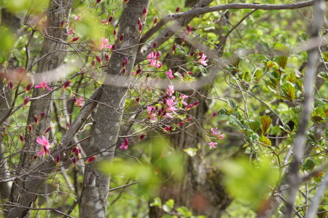 大峰から櫛形山に向かう途中、登山道の左斜面に咲いて いたシラネアオイ。 |