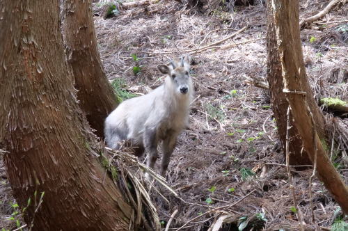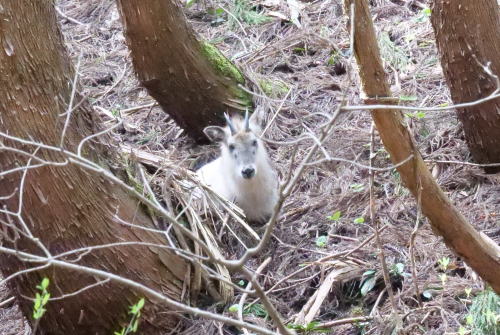 まだ白い毛が残る若いカモシカです。 出会ってしばらくお互いに見合っていました。 驚かせないように小さな声で話しかけてやったらリラックスした のかしゃがんでこちらを見ています。 |