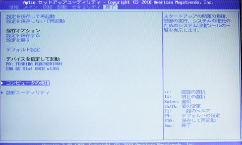 BIOSの画面に入ったら「終了」タブに移動し、コンピューターの修復を