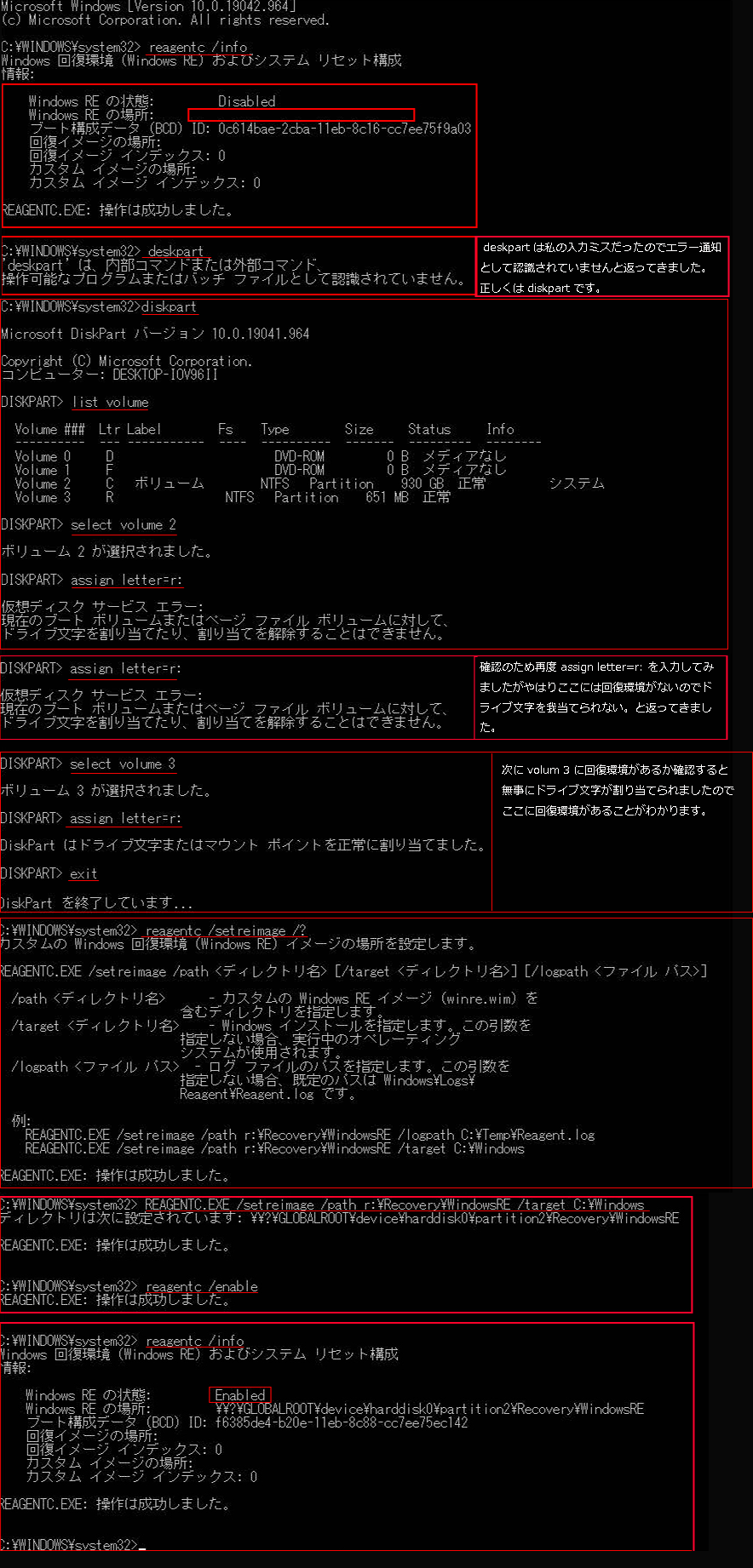 次に␣ reagentc ␣ /setreimage ␣ /? と入力し、