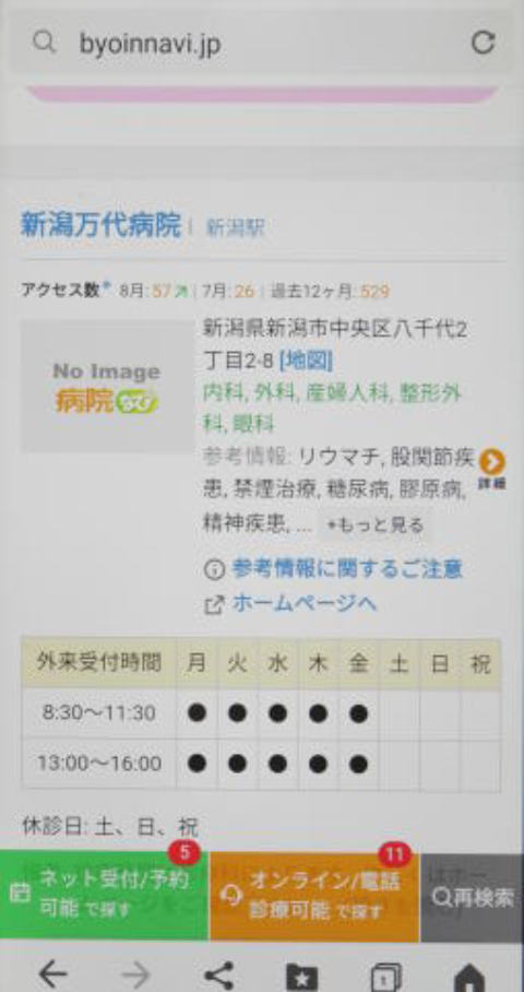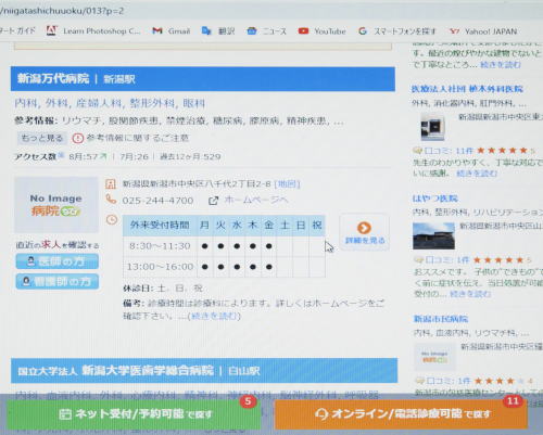 YAHOOの検索エンジンを使用し、”新潟市 整形外科 中央区”で検索すると左の画像になります。