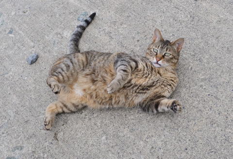 背中を撫でてやるとこのように横になって愛想を振りまきます。途中で出会った地 元の人に、この猫はどちらかの飼い猫でしょうか?って伺ったら、はっきりわか らないけれど朝になると集落から離れた岬の岩の方から通ってきているらしいとのことでした。