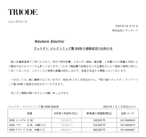 いつかは聴いてみたい と思っていた真空管、Western Electric 社の300B の価格改定を知り2023年の暮れに急いでキットアンプを購入しました。 |