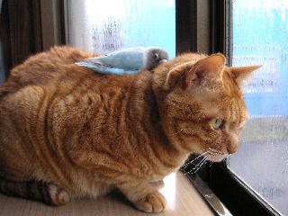 ノンがこの家に来たのは確か平成7年の年末と記憶している。 寒い年末の古町で酔っ払って歩いていた私にいつまでもニャ~ニャ~鳴きながら着いて来た子猫 がノンでした。可哀想と思って拾って帰ってきたけれど、朝になってびっくり・・・目はグチャ グチャ。そしてオス猫だったので早速、病院へ。変わった猫でした・・・「でした」と言うのは 昨年(平成16年)の2月23日に急性白血病で亡くなってしまったからです。 普段は外に出さずにいましたので時々車に乗せて散歩に連れて行きました。犬が大好きで犬を見 つけると寄って行って匂いを嗅ぎます。 また、飼っていた小鳥とも一緒に遊んでくれました。 山の散歩が大好きで木に登ったり、走ったり遊びますが飼い主の姿が見えなくなると殺されるよ うな大声を出して呼びます。 そんなノンを思い出してこのページを作ってみました。 初めての春・・・雪の窪みで 白ボタンインコのミケを背に乗せて