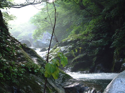 前方のやや奥に白っぽく見える石の先は大きな淵
