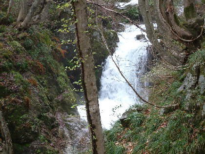 この滝の上に出るには一旦、下流に戻り右手にある山道に辿り着いてこの滝を巻きます。 |