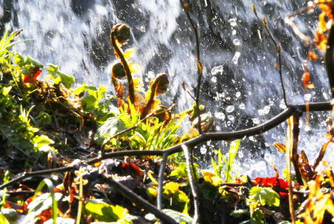 水しぶきをバックにシダ植物を撮ってみました。