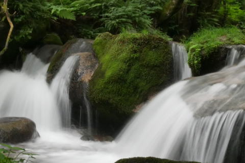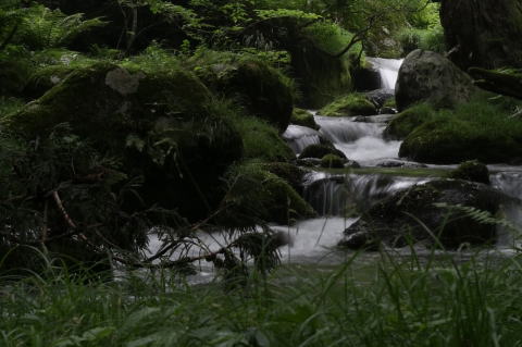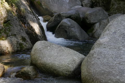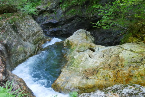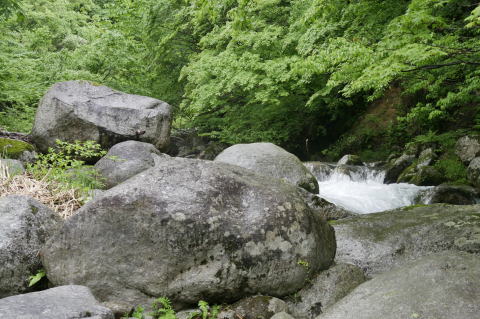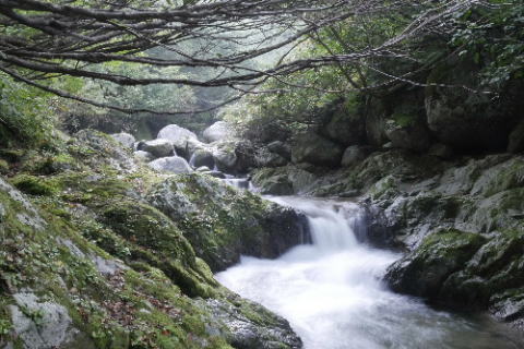 足元を滑らせたら渓流の流れの中です。 |