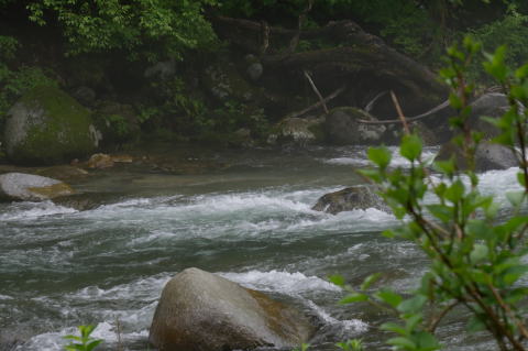 渓流が濁ると足元の石の状況がわからなくなるので川通し