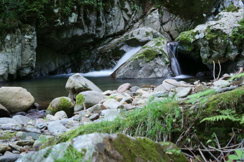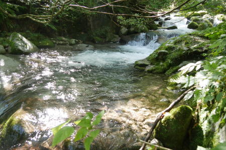 (右)から渡渉して上流に向かうのですが水深は股下一杯。