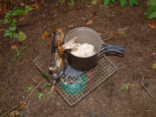 途中で採ってきたキノコで味噌汁を作り、岩魚を焼いて、アルコールタイム。