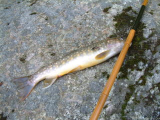朝、曇り空。テントをたたんで8時から釣り始める。毛針での釣り。